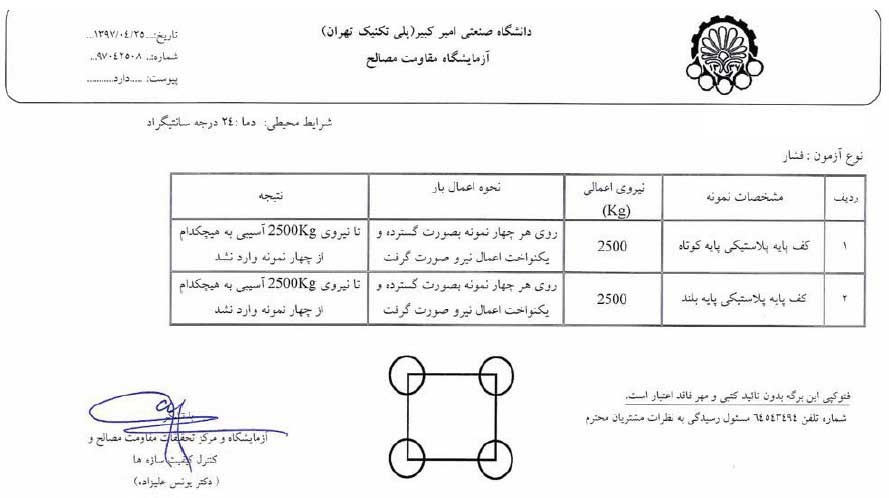 - تحمل نیروی فشاری قطعات بیس فلور در شرایط آزمایشگاهی تحمل نیروی فشاری بیش از ۲۵۰۰ کیلو گرم را دارد.