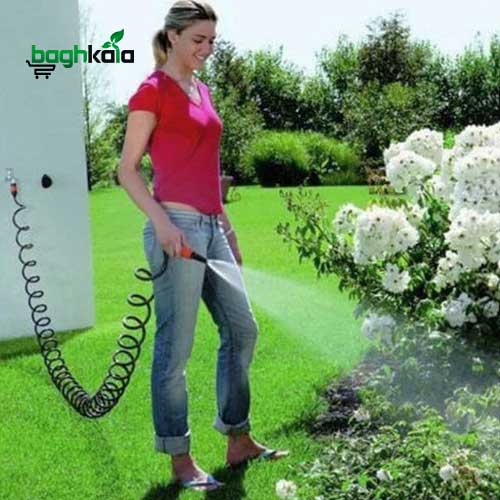 از شیلنگ فنری با آبپاش جهت استفاده در تراس، بالکن، گرین روف، حیاط، باغ و باغچه، کارواش خودرو، شستشوی فرش استفاده می شود.